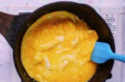 平底锅放入10g安佳淡味黄油小火融化,慢慢倒入蛋液,待边缘凝固后慢慢画圈滑炒,蛋液还有些流动性的时候即可关火,用锅子的余温使蛋液凝固。