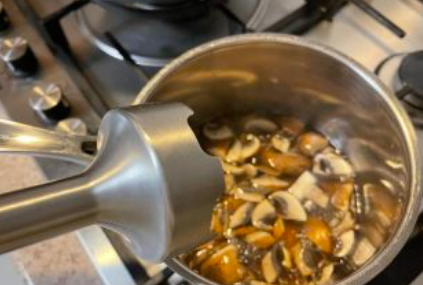 5个大蘑菇,洗干净,一半切片,一半切粒。切粒的蘑菇加小半碗高汤,煮沸。 等蘑菇变软,加入三瓣蒜。 5用手持搅拌器把蘑菇和蒜打碎。加鲜奶油,加一点味淋和黑椒盐调味。煮沸勾芡即可。