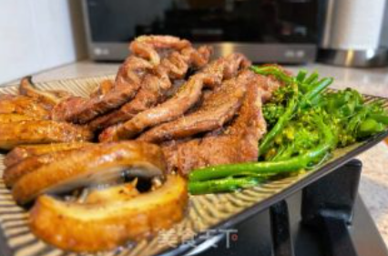 把薄片状的牛排骨中大火煎到两面金黄,撒少量黑椒盐。上盘,蘸蘑菇酱使用