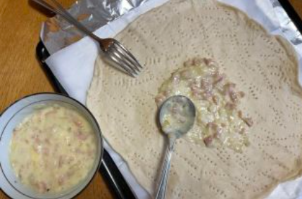 醒好的面团,用擀面杖压薄,压成饼状。戳很多小孔。抹上白汁。撒一层芝士。预热180度,第一次烤8分钟。