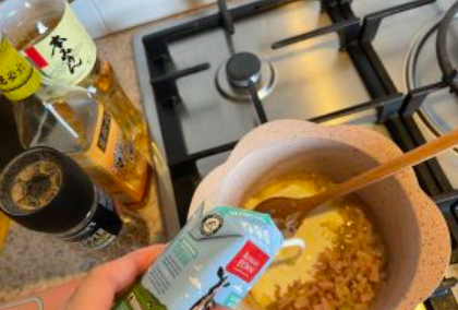 1个洋葱切粒,200g培根切粒。混合炒熟,加入料酒,糖,味淋,黑椒调味,留出三分之二作为后面步骤的披萨馅料。剩下三分之一在锅里,加入奶油,搅拌均匀。煮沸,勾芡即为白汁。