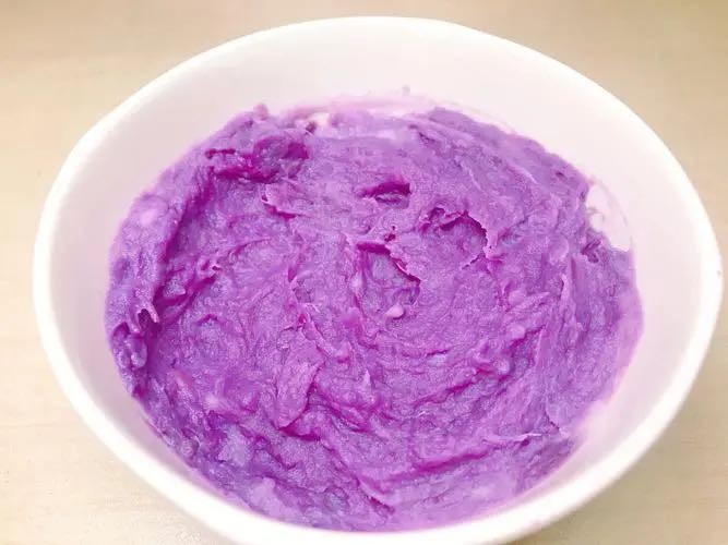 将紫薯蒸熟,然后用搅拌机搅拌成紫薯泥,放置在碗中备用