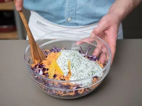 倒入蔓越莓汁、沙拉酱进行搅拌