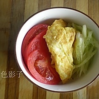 煎炒鸡蛋后将配料都摆到冷面上。