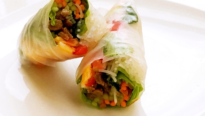 米纸用温水泡软,1—2分钟即可。(浸泡时间过长或水温过热会使米纸破碎。)取出泡好的米纸皮,将薄荷叶、虾仁、黄瓜丝、鸡蛋丝、胡萝卜丝、生菜放入其中。沿着底端向上卷起,切掉左右两端多余米皮,露出蔬菜蛋皮即可。依次制作摆盘。