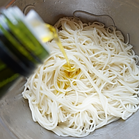 控干水的面条装入盆子里。加适量植物油拌匀,为了让面条不粘连。
