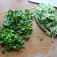 黄瓜切丝,香菜,小葱切碎。