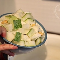把冬瓜连皮一起切成小块。 注意:既然要带皮熬糖水,冬瓜皮一定用刷子刷干净