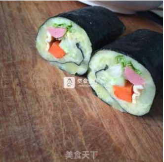 按照正常寿司铺好食材用卷帘卷好切开摆盘