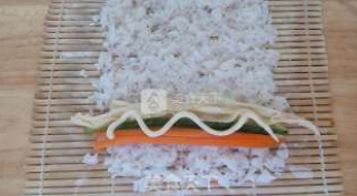 在卷帘上铺上一张保鲜膜,米饭均匀的扑在保鲜膜上,铺成长,(还可以在米饭上铺上一张紫菜,)胡萝卜条和黄瓜条、蛋片条放在米饭的一边
