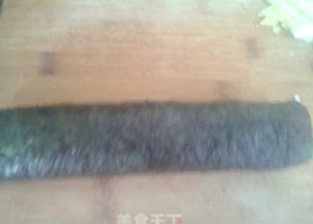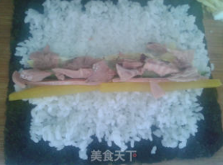 铺好紫菜,铺好一层米饭,将四种材料放在中下部分,最顶端少放点米饭。