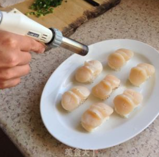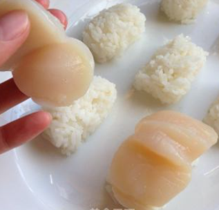 切好的鲜贝从中间打开,铺在饭团上(样子跟寿司店一样了)