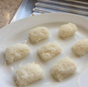 寿司米用电饭煲煮熟,加少量寿司甜醋,拌均匀,用手握成小团