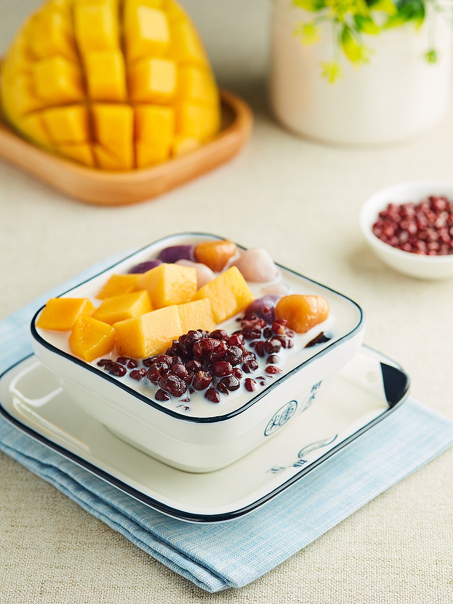 制成双皮奶,加入红豆、芋圆和芒果碎丁