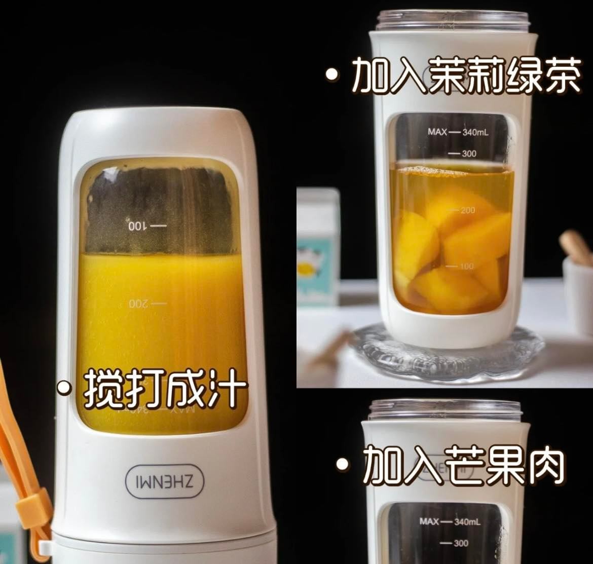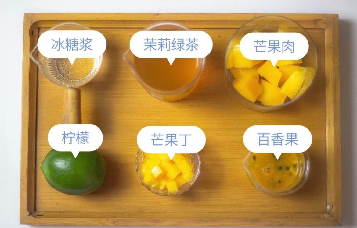 榨汁机里倒入芒果快,糖浆,绿茶,搅打成汁