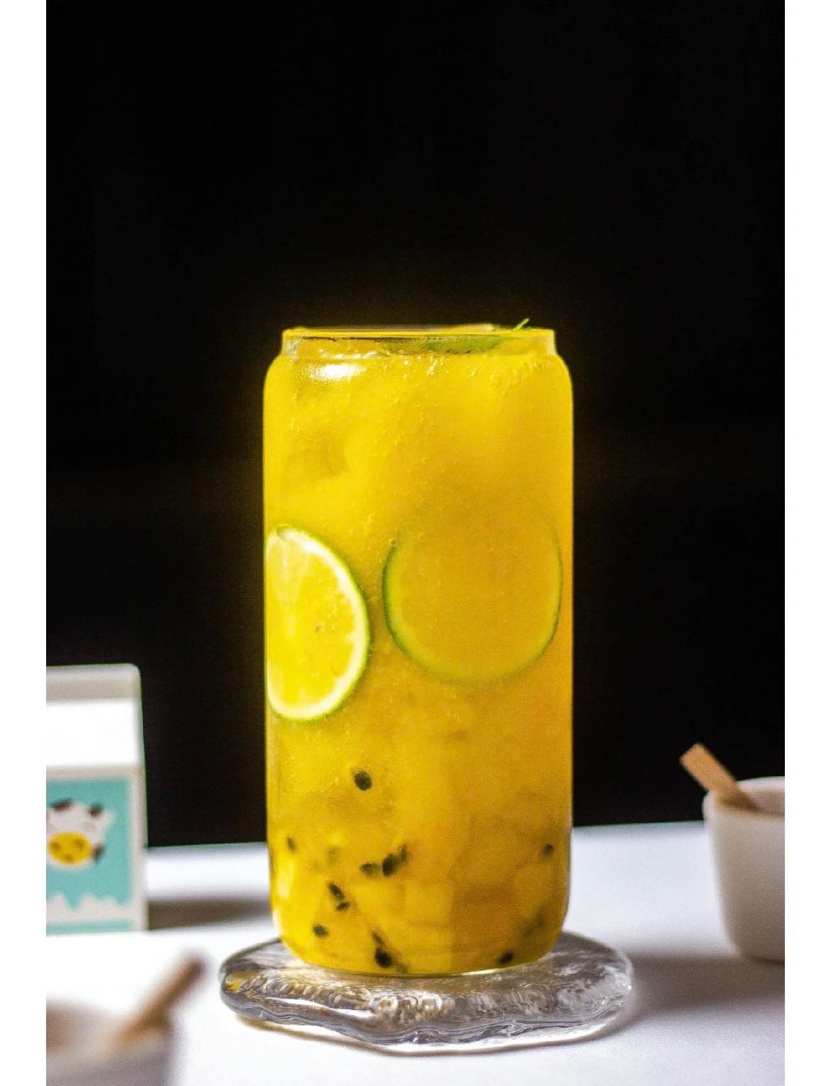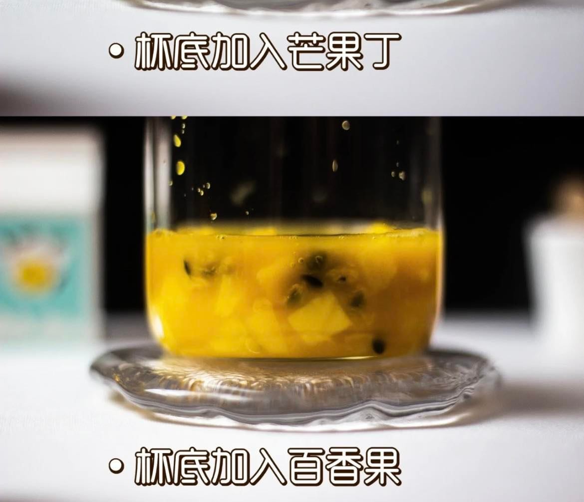 再将柠檬切片,贴在杯壁,加冰九分满,芒果汁倒入杯中至满