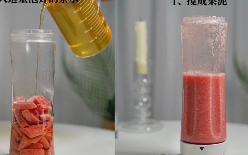 将芭乐削皮祛籽后放入榨汁机,再倒入适量泡好的绿茶,搅拌成果泥。