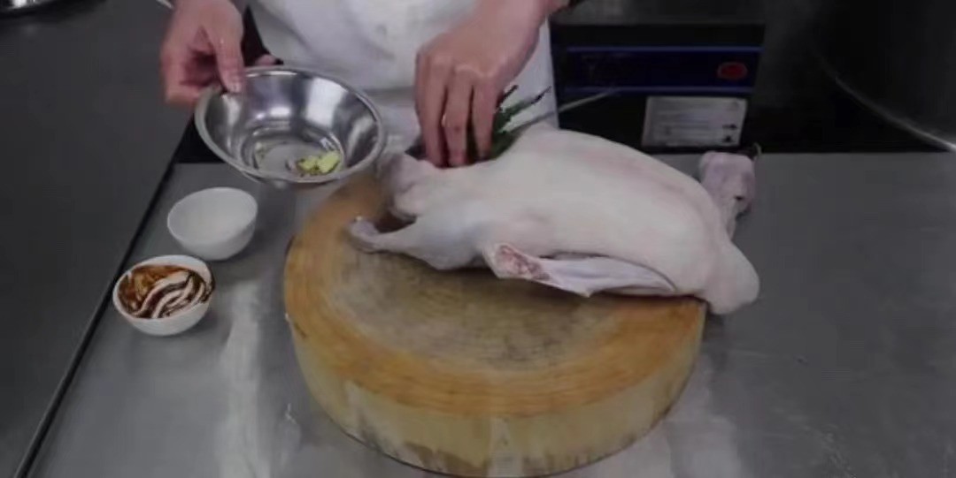 从鹅颈处充气,吹至鹅身表面发胀,起白色皮即可。烧开水放入己吹气的鹅烫皮,使表皮收紧,然后取出过冷水。