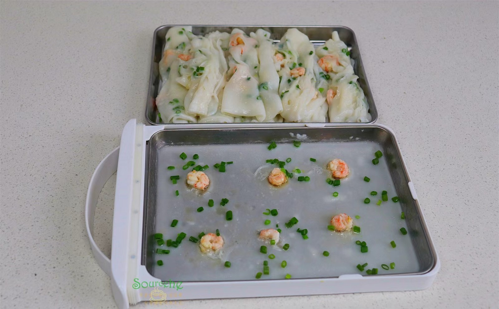 蒸熟取出,用刮板从蒸盘的一头卷起至另外一头,装入盘子,吃的时候浇上肠粉专用酱油,喜欢的还可以搭配生菜、菜心、芝麻等。