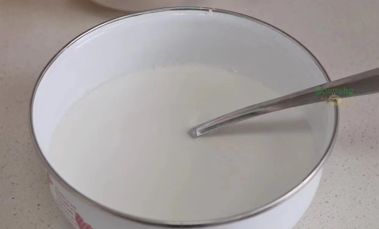 把肠粉专用粉200克,倒入一个大盘子,然后加入500克饮用水,少许盐,搅拌均匀,静放5至8分钟。