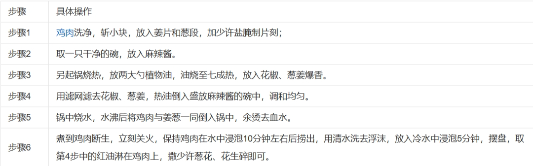 步骤1 鸡肉洗净,斩小块,放入姜片和葱段,加少许盐腌制片刻; 步骤2 取一只干净的碗,放入麻辣酱。 步骤3 另起锅烧热,放两大勺植物油,油烧至七成热,放入花椒、葱姜爆香。 步骤4 用滤网滤去花椒、葱姜,热油倒入盛放麻辣酱的碗中,调和均匀。 步骤5 锅中烧水,水沸后将鸡肉与姜葱一同倒入锅中,氽烫去血水。 步骤6 煮到鸡肉断生,立刻关火,保持鸡肉在水中浸泡10分钟左右后捞出,用清水洗去浮沫,放入冷水中浸泡5分钟,摆盘,取第4步中的红油淋在鸡肉上,撒少许葱花、花生碎即可。