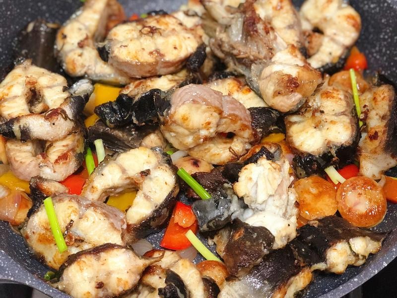 鳝差不多煎好,就把配料一起放进去炒1炒,筛上迷迭香配料粉,柠檬叶碎,香葱就可以了