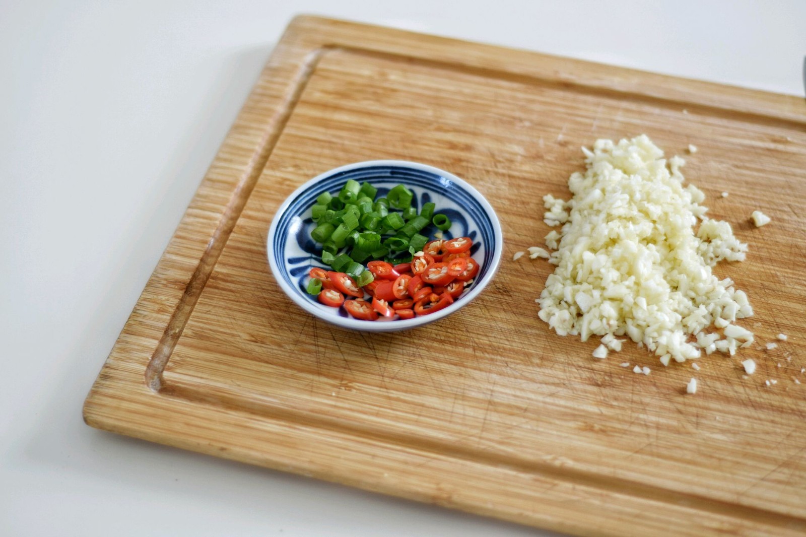 大蒜剁成蒜末,在一个大碗中,混合生抽、醋、盐,搅拌均匀。