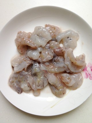 鲜虾去头壳和虾线,从背部剖开别切断,用盐、胡椒粉、淀粉、蛋清抓匀腌制