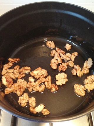 煮好的核桃仁,放油锅中炒至金黄色有香味,盛出备用