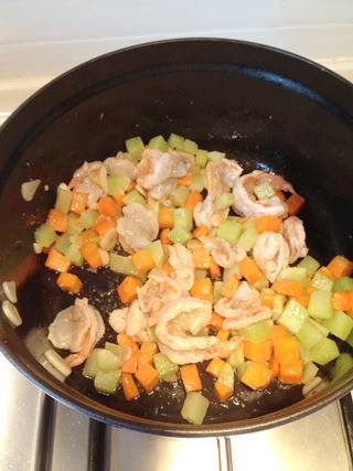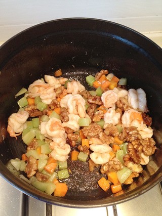 炒好菜丁后放入腌好的鲜虾