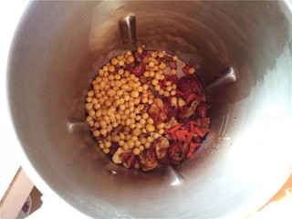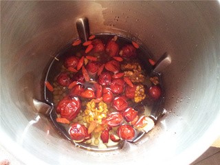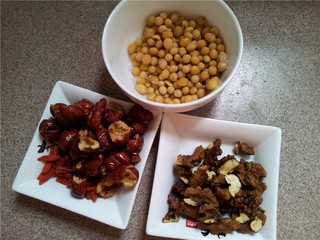 黄豆洗净。红枣去核洗净。枸杞洗净。核桃去壳洗净