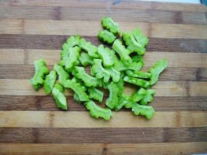 苦瓜对半切开再切成稍厚的小片。