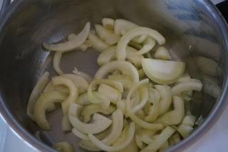 中火,锅里放入一勺橄榄油,放入洋葱,翻炒到洋葱颜色透明