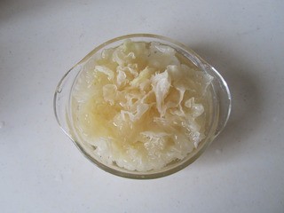 将银耳用冷水泡上半个小时,再洗净摘成小朵;