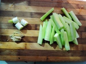 黄瓜去皮洗净切成小条,葱切段,姜切丝。