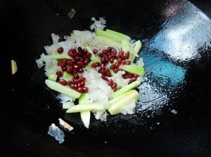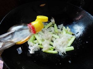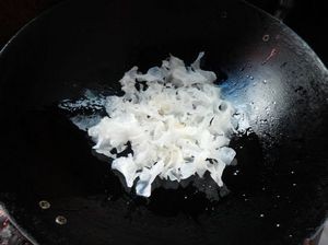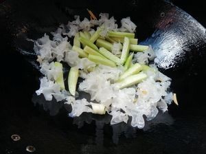 锅底留油下葱段姜丝炒香后放入银耳翻炒一会。