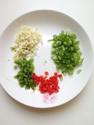 将大蒜切末,葱切葱花,青红椒切末备用