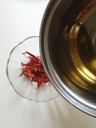 烧开花生油,浇到盛干红辣椒的碗中