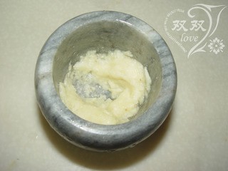 蒜剥皮,放盐,敲碎成泥。