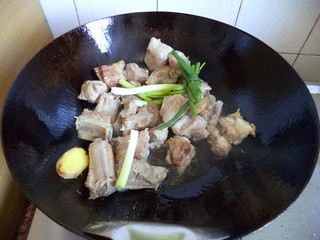 锅烧热,放油,下排骨煸炒至表面略带焦香,然后把葱姜放入炒香。