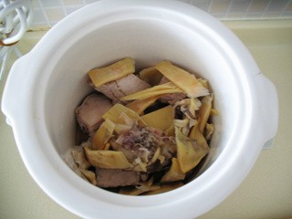 加入少量生抽、稍多些的料酒,适量水,通电炖盅工作,约煲3小时左右。