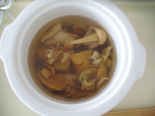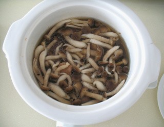 炖盅内加入蘑菇、盐继续煲半小时。