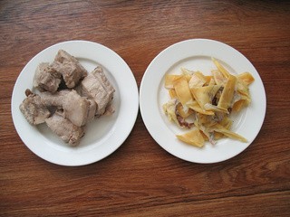 排骨焯水。墨鱼干去掉赃物,撕去外皮,切小块。