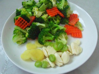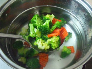 西兰花切小朵,胡萝卜切片。烧开水先把西兰花焯水,5成熟放入胡萝卜烫一下,沥干。