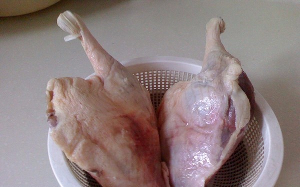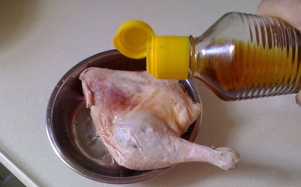 鸭腿清洗干净,然后淋入料酒涂沫鸭腿正反面