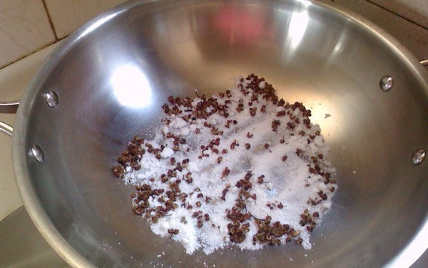 花椒和食盐一起加入炒锅内,小火炒至花椒出香味,食盐变微黄色