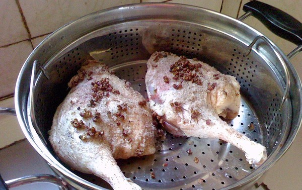 腌好的鸭腿放上蒸笼大火蒸20-25分钟(用筷子插放肉质最厚处,没血水漏出就好),待鸭腿蒸好后,再擦去表面的椒盐