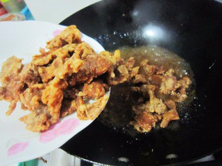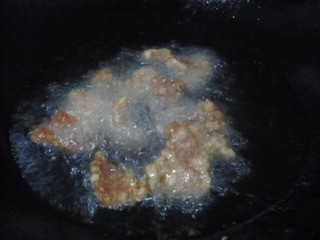 肉片腌制20分钟后,下热油锅炸制一遍后再复炸一次,这样肉片更焦脆、易上色。