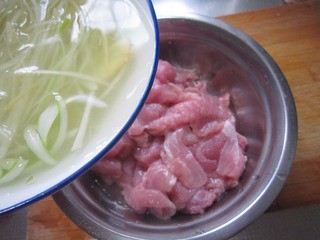 里脊切3-5cm宽的肉片,用刀背在每片肉上剁几下。