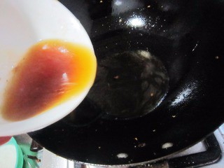 将调味汁下入炒锅后,见调味汁开锅后,小火下入生粉芡汁。